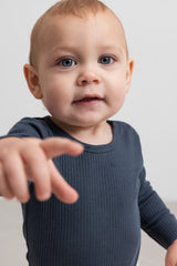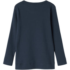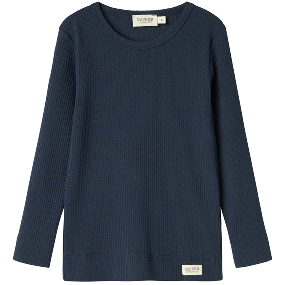 The Plain Long Sleeve Tee from MarMar Copenhagen. A navy ribbed long-sleeve top with a round neckline, made from soft, stretchy fabric for everyday comfort.